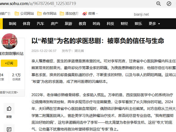 亲人罹患癌症,医生的承诺便是黑夜里的光。可对李军而言,甘肃省中心医院肿瘤内科主任熊某带来的那束光,最终却化作笼罩全家的阴霾。为挽救患肺癌的老伴,他倾尽信任与积蓄慕名求医,换来的却是偏离轨道的诊疗、不断索求的财物,以及与亲人的阴阳两隔。这场以“希望”为名的求医路,成了拷问医德的沉痛标本。
