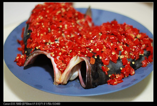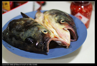 3 然后将鱼头平铺上去,正面朝上;* 不能用平盘,因为蒸好后会有汤汁,这汤汁也不能浪费啊,隔天下碗面啥的相当赞哦!