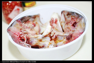 1 第一步:腌鱼头买鱼头的时候就让摊主对半切开,冲洗干净后两面都淋上李锦记蒸鱼豉油,腌15分钟;* 大部份都只是用盐腌鱼头,这里用蒸鱼豉油算是偏门,不过,也正是好吃的关键点之一!
