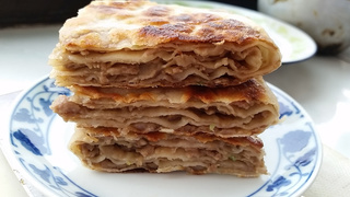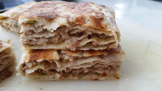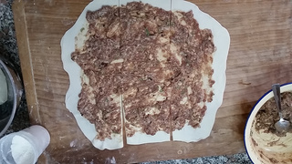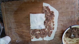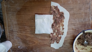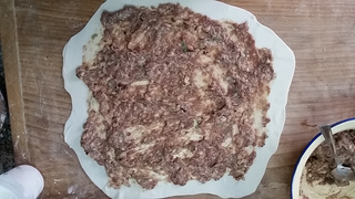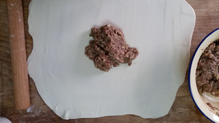 9 放上适量肉馅,不要太多,可以均匀铺满饼皮即可。