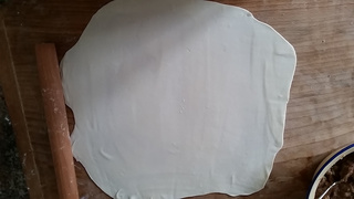 8 取适量面团擀成薄薄的大面片,薄厚要均匀,厚度大约在1-2毫米。
