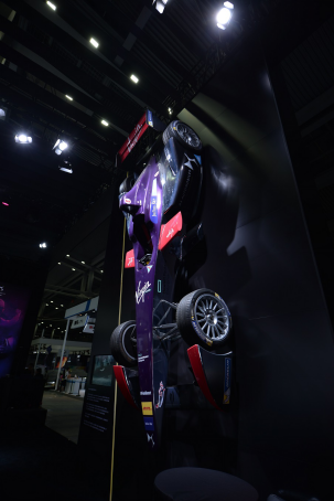 在DS展台,刚刚走下FE赛场的战车DSV-01同样吸引了不少观众驻足。其外观设计以对速度的极致追求为中心,类似F1赛车的外形有效降低了行驶中的风阻,几乎与地面相贴的底盘大大提升了车辆的抓地力和稳定性,紫色与黑色的配色则带来了强烈的视觉冲击感。