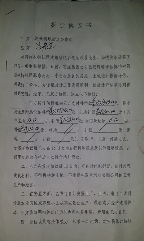 2011年下半年又开始启动拆迁,2012年10月政府和村民按照原评估方案签订补偿协议。村民按照协议15日内进行了拆迁,拆完之后由于补偿金额过大,露天矿业不认可政府与村民之间的补偿协议,无奈政府终止履行。