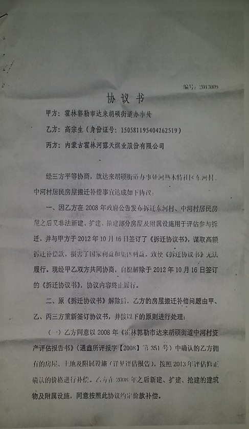 村民称,内蒙古霍林郭勒市政府2008年起对原东、中河村整体拆迁规划并实施。因资金问题搬走240户,剩余61户未实施搬迁。2012年10月18日剩余的61户与政府签订拆迁补偿协议,并按照协议内容要求在15日内自行拆除了房屋及附属设施,但时至今日仍然没有收到政府支付的房屋等补偿款。半年后政府认为已经拆除的房屋及服务设施评估数量有问题,要求在没有任何建筑物的情况下,依据2008年和2012年初的数字重新评估,然后签订政府、企业和群众的三方协议。因重新评估后原赔偿数额直接减半,为此老百姓拒绝签字并多次逐级上访到通辽、内蒙古及北京,在上级政府批示及上访压力下霍林郭勒市政府专门成立了推进组和调查组解决中、东河村拆迁补偿问题。
