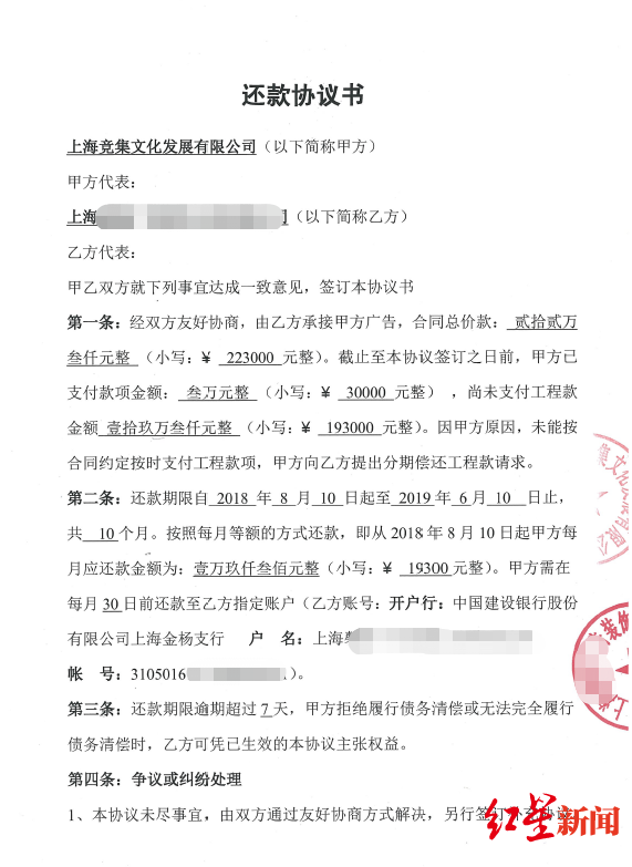 据催债者们统计,上海竞集文化发展有限公司共拖欠了约20家商户或供应商至少575万元。其中,一装饰公司被拖欠92.8万元,在众多催债者中数额最大。据该公司负责人告诉红星新闻,“经朋友认识徐某,去年八九月,签订了还款协议,但只还了一笔,原本一百余万”。
