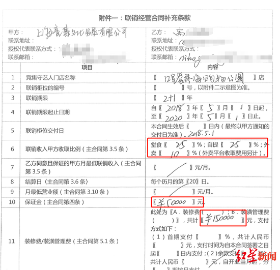 红星新闻获得的王倩与高磊签订的《联销经营合同》及其《补充条款》显示,联营期限自2018年5月1日起至2020年5月1日止,上海竞集文化发展有限公司收取联销收入的25%(外卖10%)。高磊需支付5万元保证金、15万元装修费和装潢管理费。